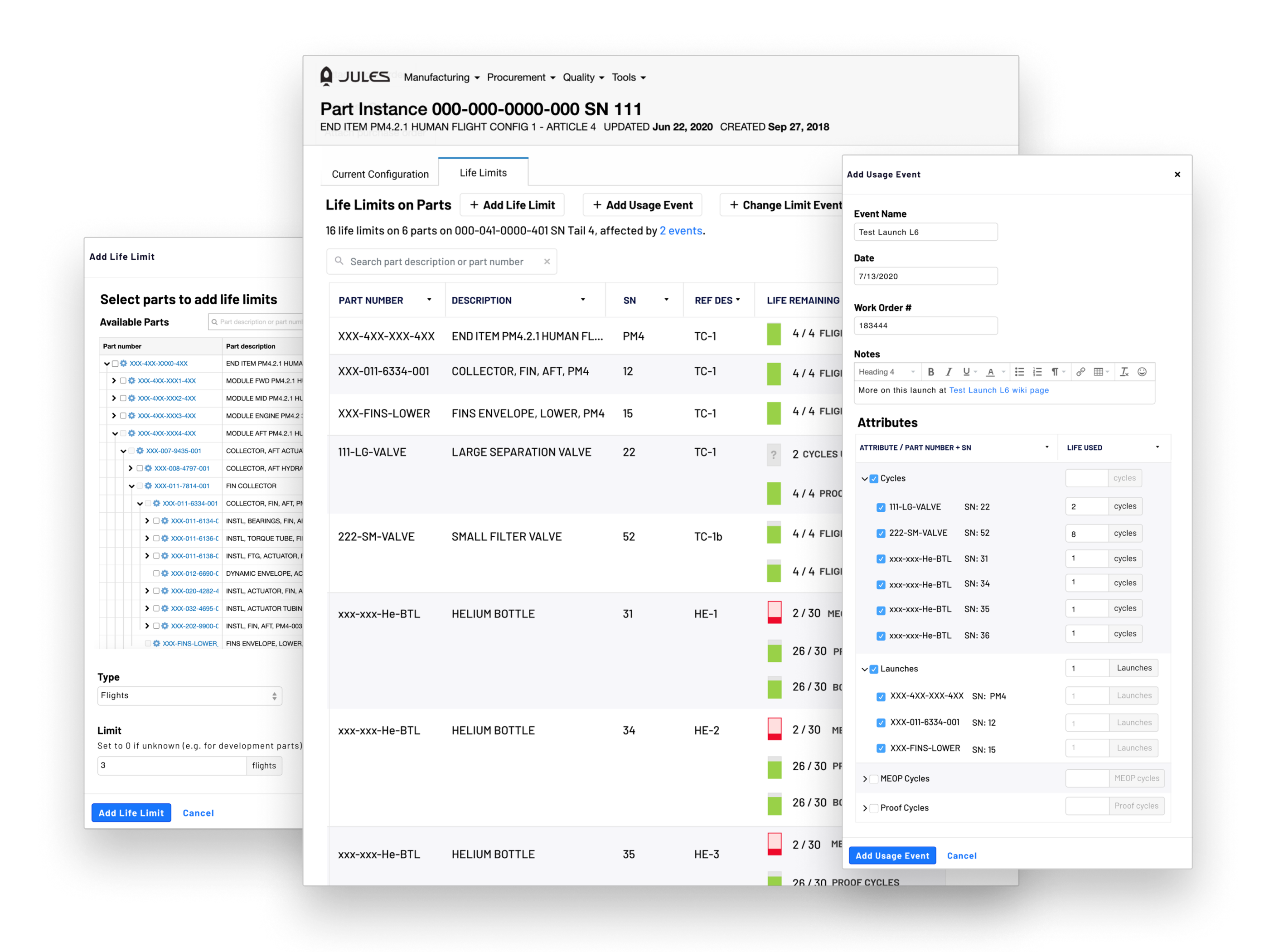 Blue Origin is an aerospace manufacturer and spaceflight services company founded by Jeff Bezos. Rocket Life tracked limited operating life on reusable launch vehicle components to ensure parts were inspected and replaced before they exceeded safe flight limits.