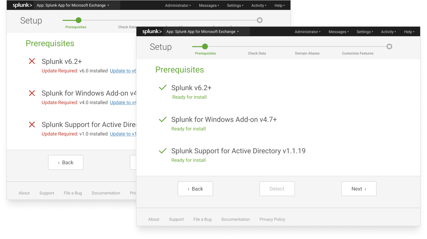 The Exchange app had three critical dependencies — Splunk itself, the Windows add-on, and Active Directory support — and none of them were checked before install. Admins would download the app, hit a wall, and call support. I designed a setup wizard that detected prerequisites automatically and only let admins proceed once their environment was ready.
